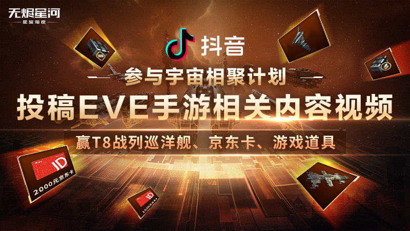在抖音投稿EVE手游相关游戏内容,就有机会赢取游戏内精装舰船、各类豪华游戏道具,最高可获得价值2000元的京东电子购物卡!快来分享你在EVE手游中遇到的各类趣事,参与活动赢豪礼吧!