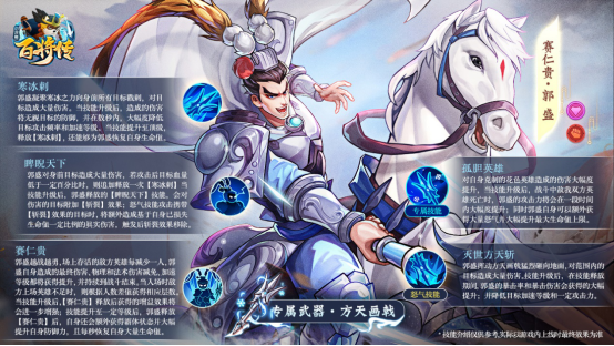 郭盛的【寒冰刺】、【睥睨天下】、【赛仁贵】技能都可以对目标造成大量伤害;