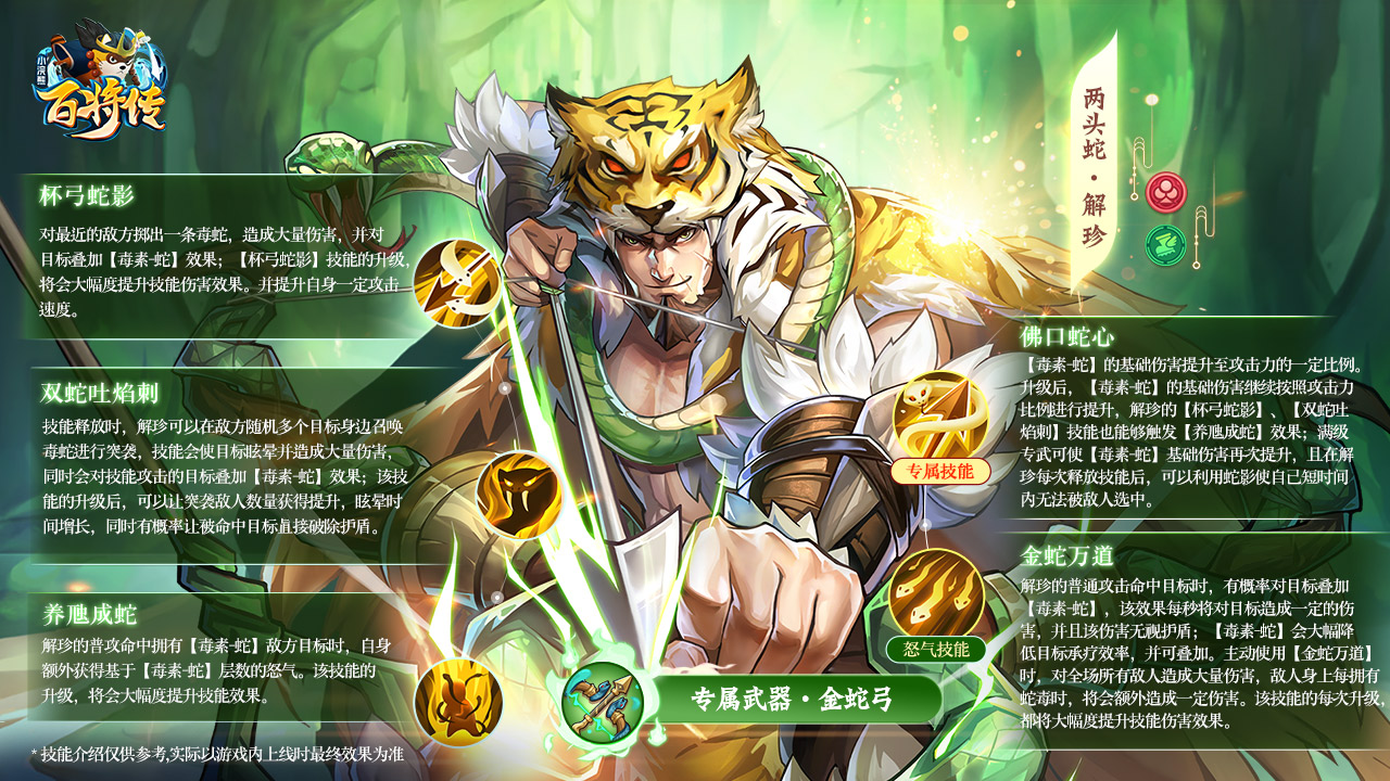 解珍的核心技能设计参考了他的绰号和原著中的经典形象,以“蛇”与“毒”作为最核心进行展开。也因此解珍在成型后,具备叠毒续伤和穿透护盾能力。