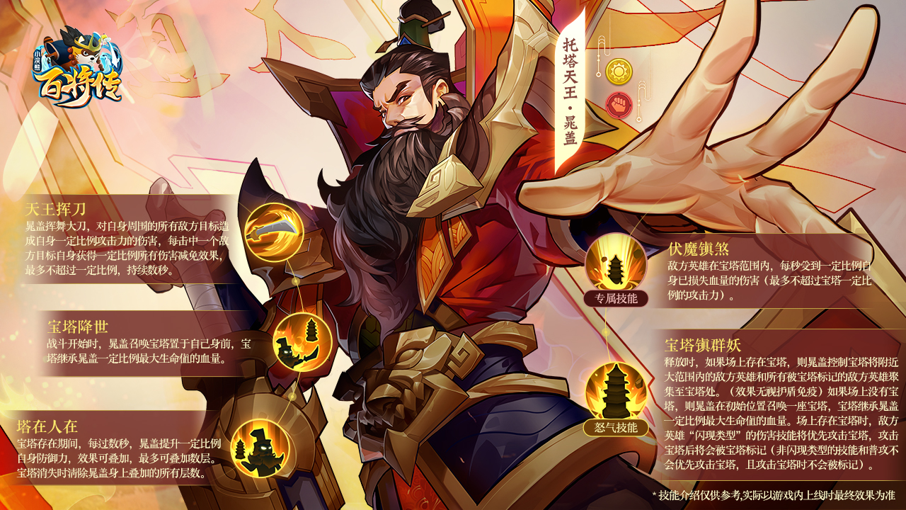 游戏中,晁天王夺取的宝塔将会发挥重要作用,对敌方位移类技能形成致命限制。宝塔在场时,晁盖将控制宝塔,把附近大范围内的敌方英雄和所有被宝塔标记的敌方英雄,聚集至宝塔处(效果无视护盾免疫)。场上存在宝塔时,敌方英雄“闪现类型”的伤害技能将优先攻击宝塔,攻击宝塔后将会被宝塔标记(非闪现类型的技能和普攻不会优先攻击宝塔,且攻击宝塔时不会被标记)。