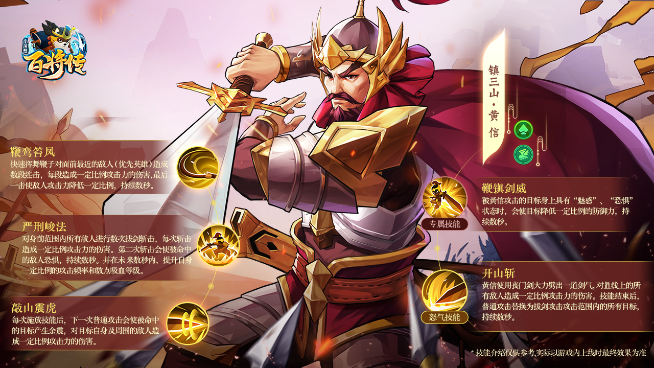 游戏中,黄信能释放怒气技能“开山斩”,使用丧门剑大力劈出一道剑气,对直线上的所有敌人造成攻击力高额的伤害。同时利用专属技能,当被黄信攻击的目标身上具有“魅惑”、“恐惧”状态时,还能使目标防御力和治疗效果降低,并清除其身上所有剩余护盾值。