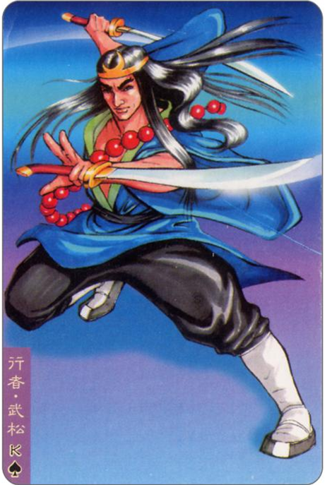 为了给哥哥报仇,武松先杀潘金莲再杀西门庆,刺配孟州的途中更是醉打蒋门神、血溅鸳鸯楼。此后,为躲避官府抓捕,武松改作了头陀打扮。在经典水浒卡中,他有又黑又密的两条剑眉,眉头紧锁,头戴戒箍儿,胸脯横阔,骨健筋强,整个人都散发着寒冷的光芒~
