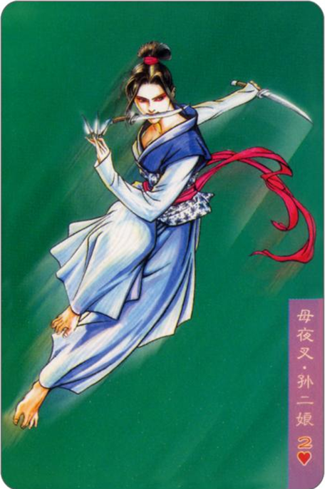 孙二娘原是十字坡黑店的老板娘,与丈夫张青开酒店杀人夺货,卖人肉包子。她浓妆艳抹,酥胸半露,横眉立目,一手持钢刀,另一只手里拿着三发迷魂镖,全身都散发着杀气~