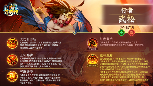 在游戏中,武松是黑桃阵营的力量型英雄,其怒气技“法相金身”在进入战场后能产生“法相金身”对武松本体进行加持,使武松获得技能免疫、伤害加成等多种效果。此外,武松的CV是配音界的元老姜广涛老师,一句“金身护体,无相无我”为武松更增添了几分霸气~