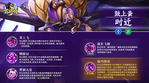 正如原著赞诗中“骨软身躯健,行步似飞仙”所说,时迁身手敏捷,机警灵敏。在游戏中,他是方片阵营的敏捷型英雄,能使用月牙妖刀闪现到敌人身后,造成一定的伤害;还能多次偷取敌方英雄的攻击力、防御力、生命值,提升自身的属性。