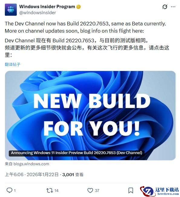 微软今日向 Dev 频道 Insider 用户推送了最新的 Windows 11 预览版本 Build 26220.7653。