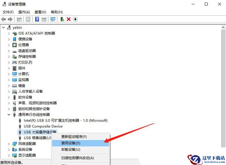 2、找到出现问题的USB设备,并右键点击它,在打开的菜单项中,选择禁用设备;