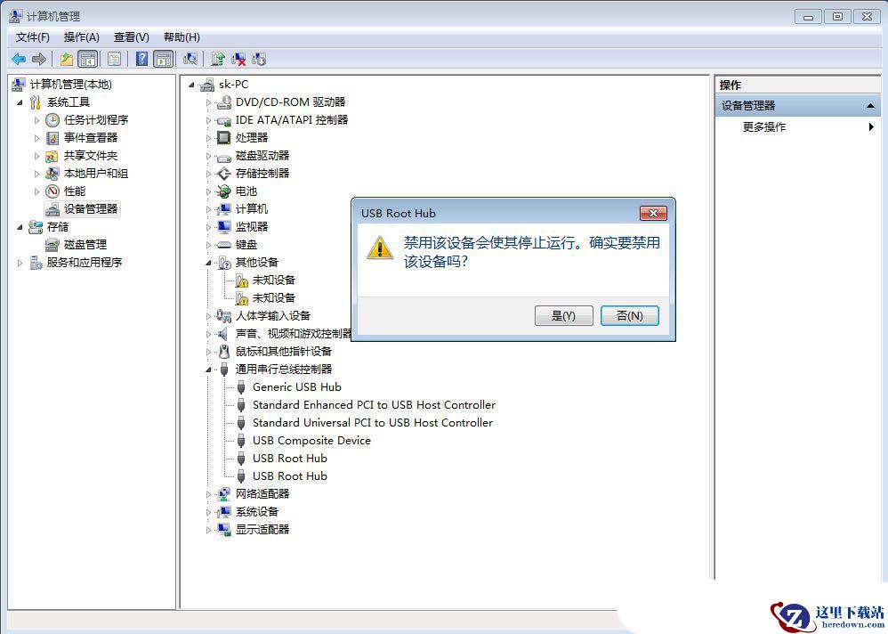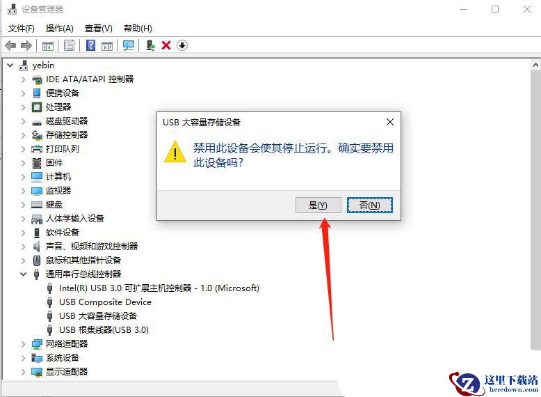 4、弹出提示框中,点击【是】,再【右键】点击该设备,在打开的菜单项中,选择【启用设备】,最后重新插入USB设备即可;
