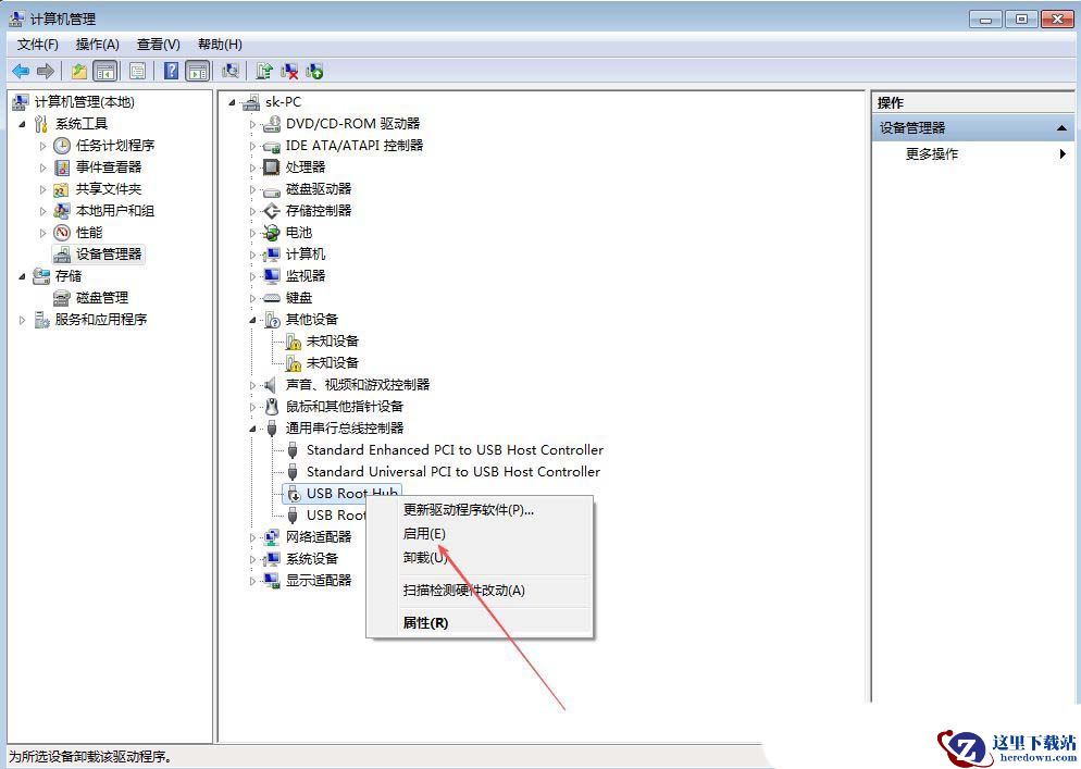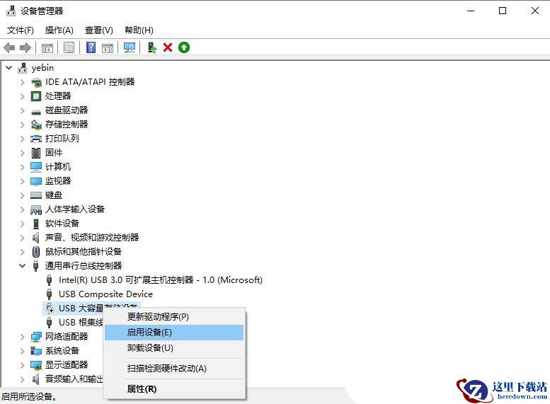5、最后,再右键点击此设备,选择“启用”,重新插入USB设备即可;