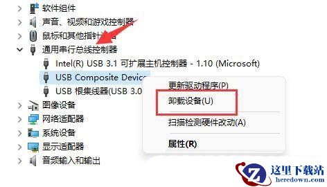 3、右侧找到并点击展开【通用串行总线控制器】,选择无法识别usb设备的【USB接口】,并点击【右键】,在打开的菜单项中,选择【卸载设备】;