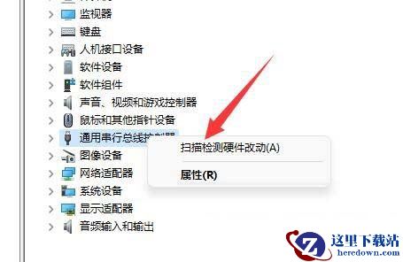 5、卸载完成后,需要重新插入USB设备,再返回到设备管理器,找到并【右键】点击通用串行总线控制器,在打开的选项中,选择【扫描检测硬件改动】就可以了;