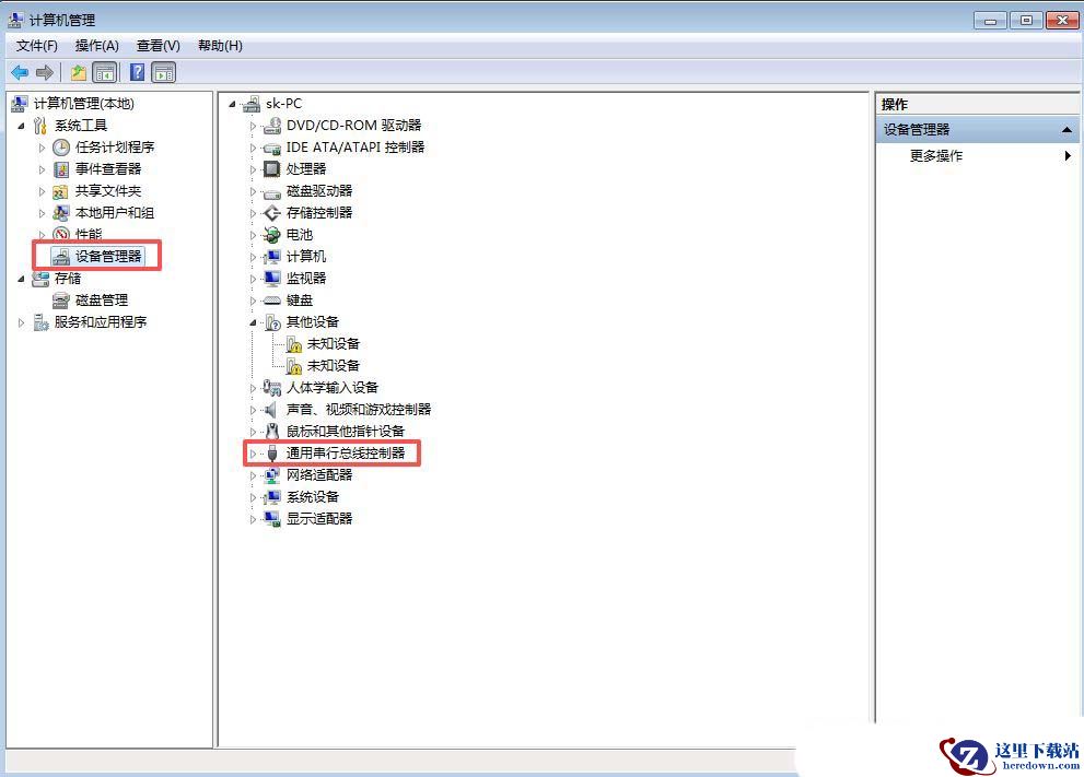 2、然后左侧点击【设备管理器】设备管理器窗口中,点击展开【通用串行总线控制器】;