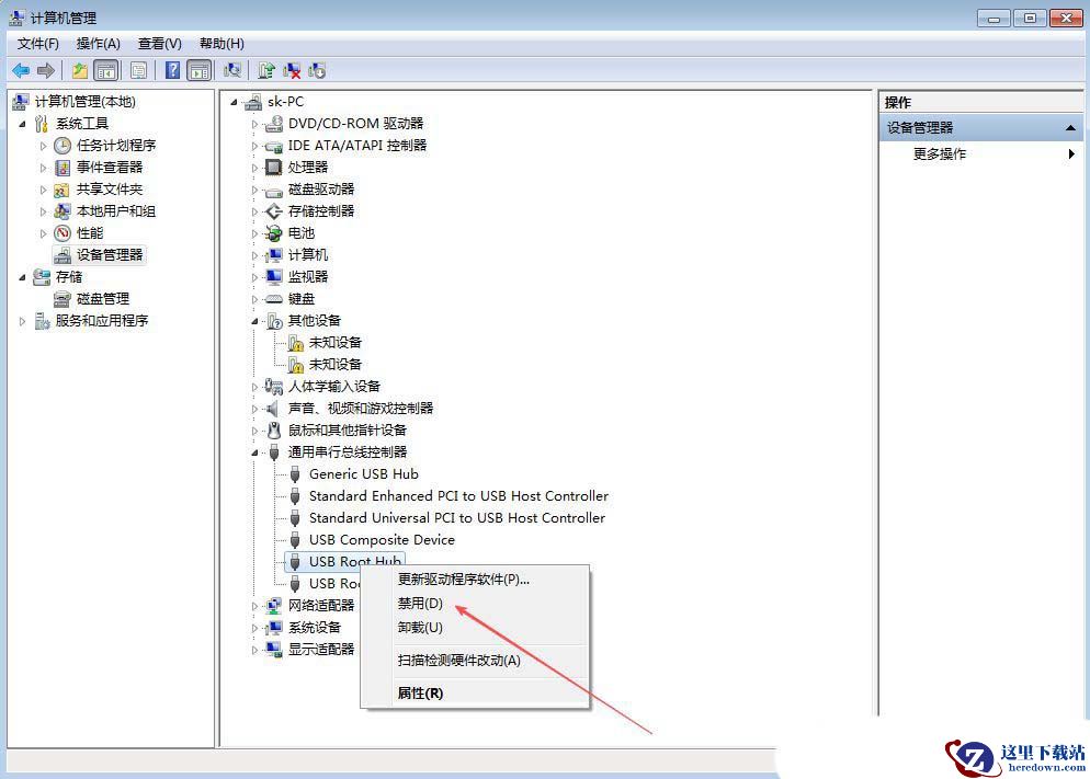 3、然后,右键点击其中任意一个“USB Root Hub”,选择“禁用”该设备。
