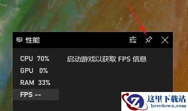6、Xbox Game Bar打开后,在界面中找到性能面板,点击右上角的钉子图标,就能将性能面板固定住;