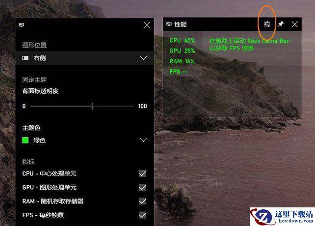 最后,Xbox Game Bar(游戏栏)默认会显示FPS、平均FPS、动态曲线三组参数,同时还有CPU、GPU、RAM等其他监测指标,用户可以通过点击面板右上方的设置按钮,手工调整这些监控项。包括监测指标、主题色、背板透明度等都可以定义