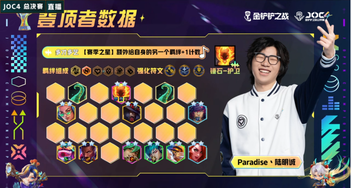 各位弈士,第四届金铲铲之战公开赛(J Open Championships 4,JOC4)已于2月25日圆满落幕,让我们一同恭喜选手萨科丶肖洁在决赛中成功登顶,摘得本届JOC4桂冠!