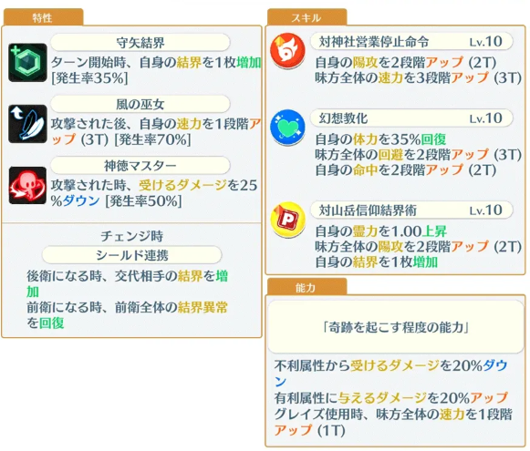 能够提升全队的速力和阳攻等级(速力提升比较大),自身终符有妖怪妖精特攻,虽然有斩裂词条,但是加成很低,没有太多出彩的地方,阳攻和速力面板还行,经过预热后打出的输出还可以(比以前些些l限定高,像赫卡这种除外),不过实用度一般。