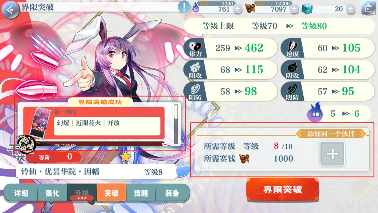 突破会增加六维属性,同时增加出击消耗