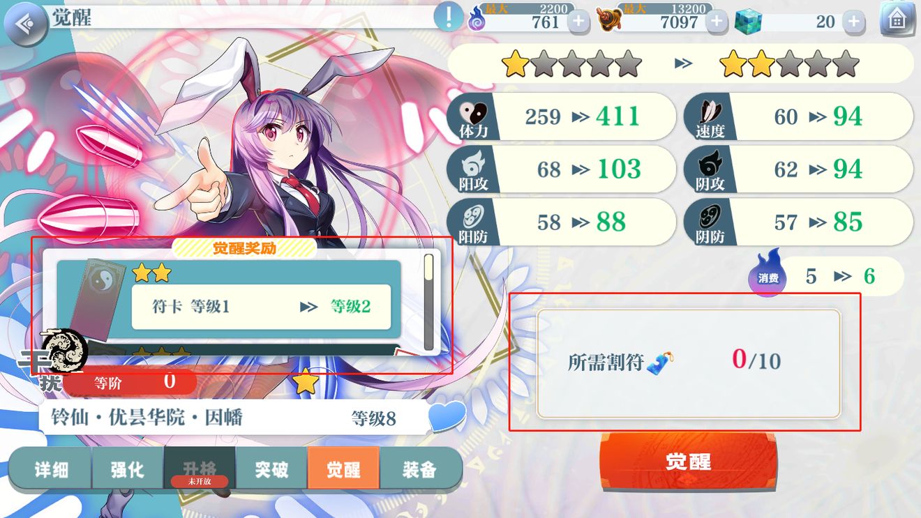 觉醒:通过觉醒可以提升角色六维同时增加星级和符卡伤害,所有角色觉醒的道具均为割符,而割符的来源为贩卖角色和绘礼;觉醒也会增加出击消耗。