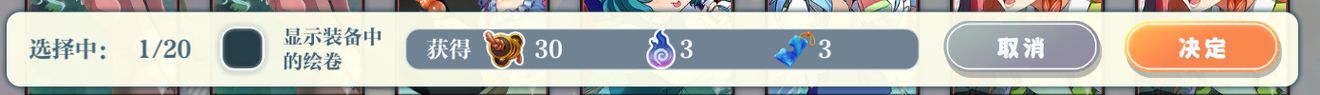 多余的绘卷可以分解变成材料和赛钱,3星的绘卷可以分解为10赛钱、1体力、1割符;