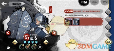 孟达:选择孟达的原因是我的刘封星级比较高。刘封孟达懂的都懂,二爷丢了荆州见死不救,游戏里也挺还原,给他俩弄了一个见死不救羁绊,加闪避。闪避对盾兵的收益很大,因为前排扛的越久,后排伤害就越高。