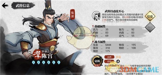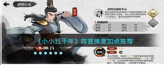 《小小五千年》是一款三国背景的策略战斗游戏,游戏中陈宫怎么样呢?很多小伙伴可能还不清楚,下面手游小编就给大家带来了《小小五千年》陈宫强度加点推荐分享,想要了解的一起看看吧!