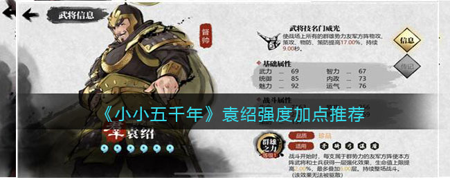 《小小五千年》是一款三国背景的策略战斗游戏,游戏中袁绍怎么样呢?很多小伙伴可能还不清楚,下面手游小编就给大家带来了《小小五千年》袁绍强度加点推荐分享,想要了解的一起看看吧!