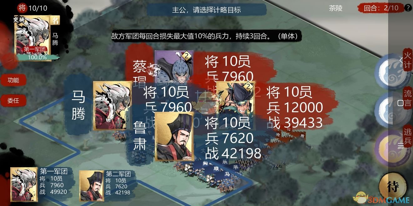 如果打郡城有三个敌方,主力最好先搞掉一个,然后无限流言+火计之类。