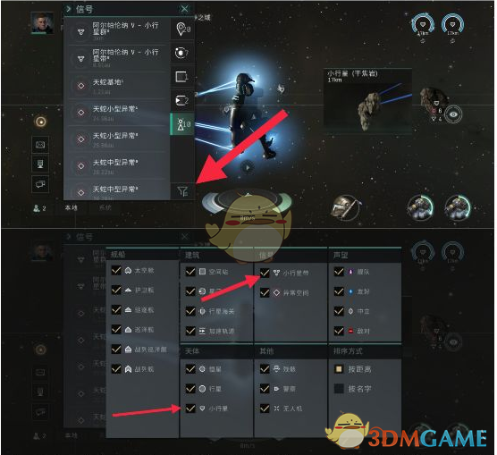 出空间站后总览的筛选,选择合适的小行星带,注意是否打钩(不然看不到矿)