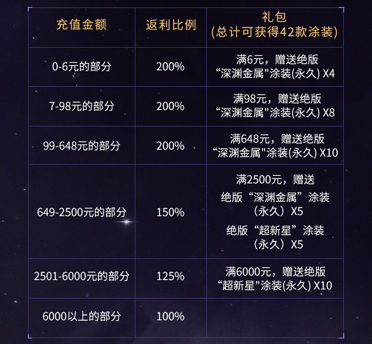 同时获得永久绝版“深渊金属”涂装4+8+10+5=27款;以及永久绝版“超新星”涂装5款。(说明:测试期间的任意充值,如购买量子元和欧米伽克隆,公测返还皆为量子元)