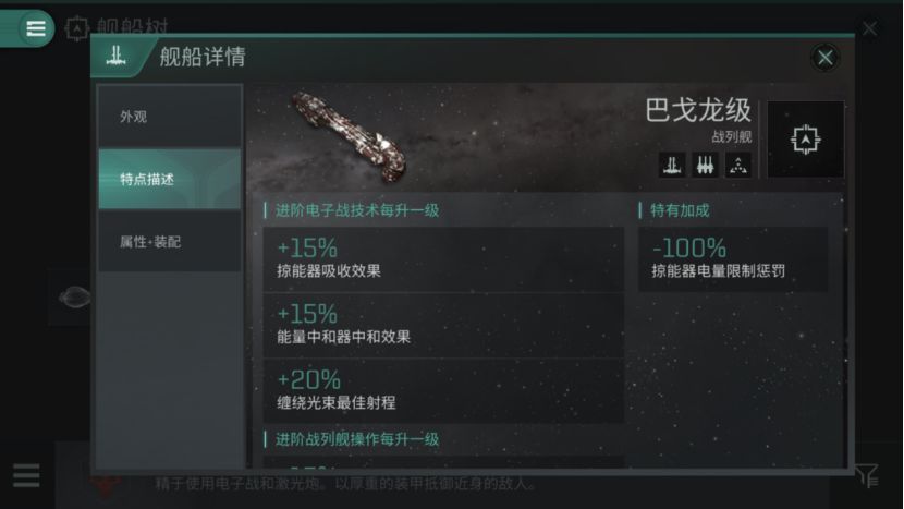其舰船除了有着最具特点的加成“掠能器电量限制惩罚–100%”,还对掠能器和能量中和器都有着极为高额的加成。这就使得再强大的舰船在面对它们时,其电量也会在短时间内被抽干毁净,全身装备能运转的九不存一,最后只能饮恨当场。