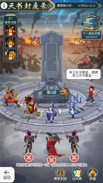 4、天书封魔录以赛季形式进行开启,每个赛季持续30天,前24天每天可领取若干张法术牌。在赛季结束后,会根据防守波数,发放赛季奖励。