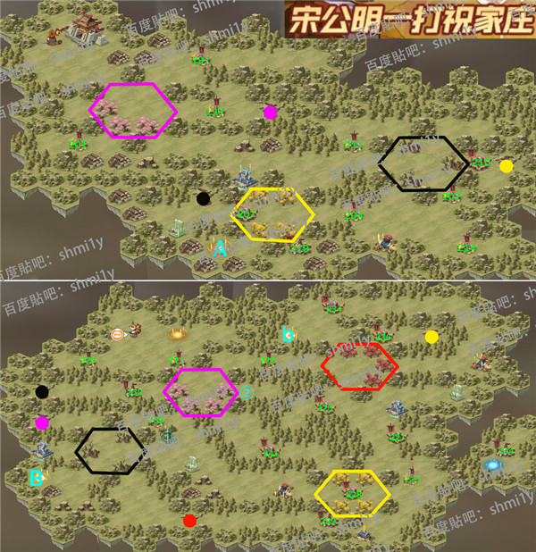 ② 如果你是刚刚解锁本章的小号或者新号,按打斗点小怪的等级顺序从低到高,一路吃buff升战力打是很重要的,这样能保证以最低的战力过关。所以本攻略的核心路线还是按照打怪的顺序来引导的。关于本章的设定:图上的用颜色标出的六边形框区域,可以视为一组可以绕中心转动的闸门,而对应相同颜色的路标点,就是转动他的开关,本章即为一个通过开关转动路口而改变道路的迷宫。