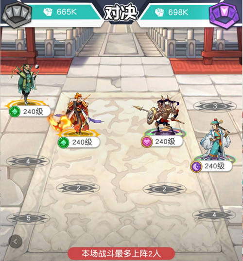 4、敌方角色(神话项充、神话西门庆)VS我方英雄( 史诗+魏定国、史诗+朱武),站位:如图,该阵容应对关卡难度:★,一次性过关几率:99%。