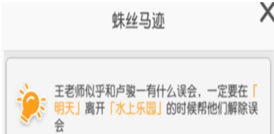 蛛丝马迹:王老师似乎和卢骏一有什么误会,一定要在明天离开水上乐园的时候帮他们解除误会