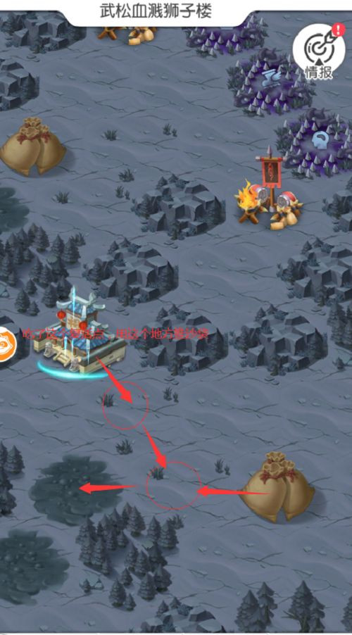 4、右下郓哥证词,首先推沙袋到右下,然后推沙袋到右,清完怪,此时有两个沙袋记为A和B,推一个出去左边树环绕一圈的中间,然后推另一个到右边泥潭清完怪,拿到证词。