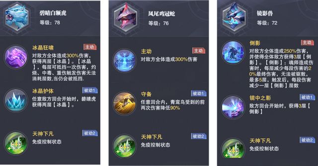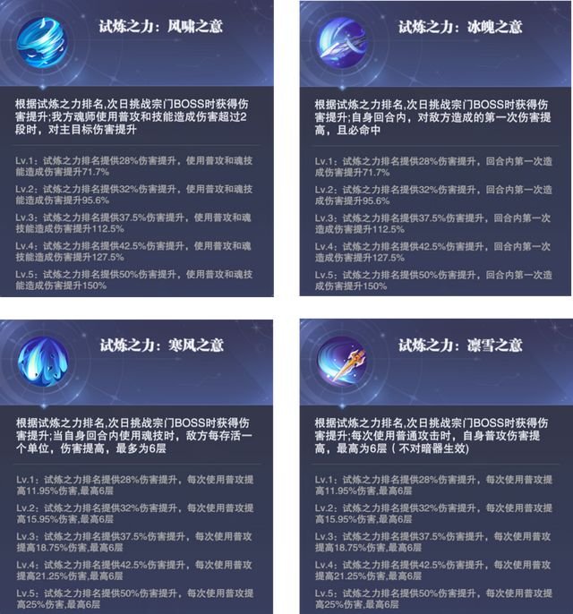 【风啸之意】:普攻与多段攻击的增伤buff【冰魄之意】:核心单段攻击的增伤buff,且提升100%命中【寒风之意】:多个敌人存在时的增伤buff【凛雪之意】:普攻增伤buff