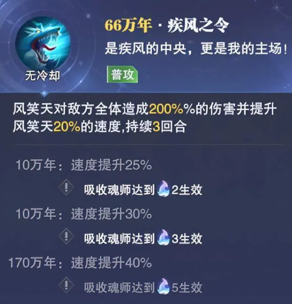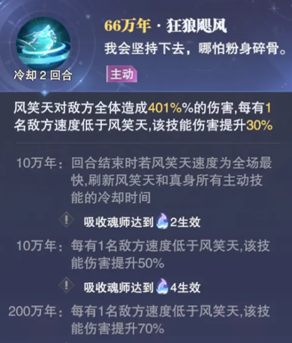 然后是风笑天真身技能,其效果是对敌方全体造成一定伤害,且根据对方速度的差距会有额外的增伤,最高可以达到420%的增伤幅度,效果还是比较不错的,另外此技能还有一个重要的价值便是当风笑天为全场速度最快,风笑天和真身的所有主动技能都将刷新cd,这也意味着风笑天和真身是可以一直不断的使用技能的,这也能让其在长图打伤害副本中的强度得到质变般的提升。