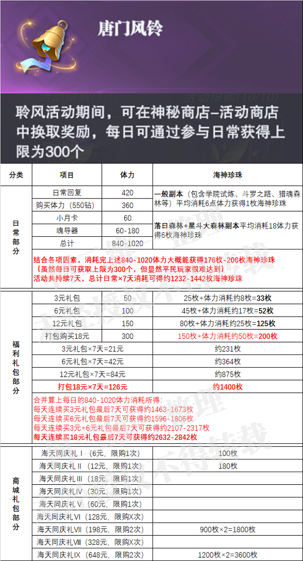 1.此次活动大致保留了和上次的海神珍珠活动类似的体力消耗比例,不过此次活动中因为有不少朋友已经拥有了魂导器,所以体力上也会出现一定的变化,这里也给大家简单计算了一下,每天都买完6次体力可以获得840体力-1020体力,其中的变化便是由魂导器的60-180体力而得的,而每日消耗完这些体力我们大概可以获得176-206个唐门风铃,活动持续7天便可以获得1232枚-1442枚唐门风铃,这个数据大家可以简单参考一下