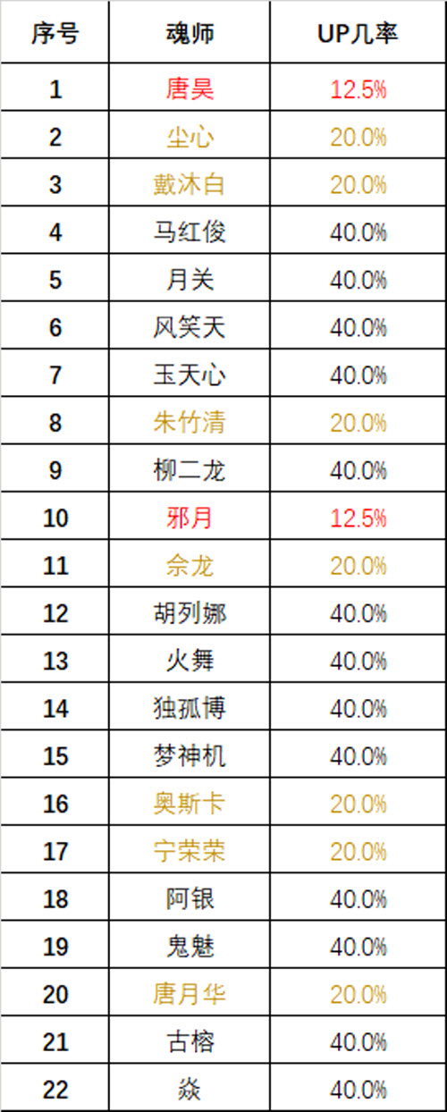这里我们可以清晰的看到所有魂师的UP几率都是不全相同的,这也能解释为何在一般的抽取过程中,我们会感到部分魂师很难抽的原因,因为他们在普通UP池里的大概抽取几率也是如上表所示的,因此就肯定有好抽和难抽之分了。另外海神祈愿池的保底是300抽,大家可以参考一下这个数据。