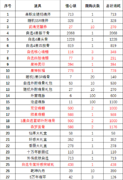 武魂觉醒券是一个永远都不过时的资源,即使大家钻石非常不足,维一都建议大家可以去把最少这10张武魂觉醒券给兑换了,总共270惜心锁其实最低只需要花费540钻石即可兑换到,换算下来就是54钻石一张武魂觉醒券,性价比还是非常高的