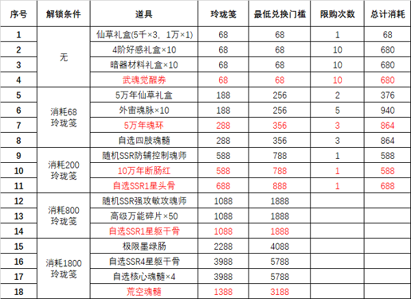 7.武魂觉醒券和5万年魂环大家都是多多益善,所以累200玲珑笺的消耗可以考虑用这两项资源