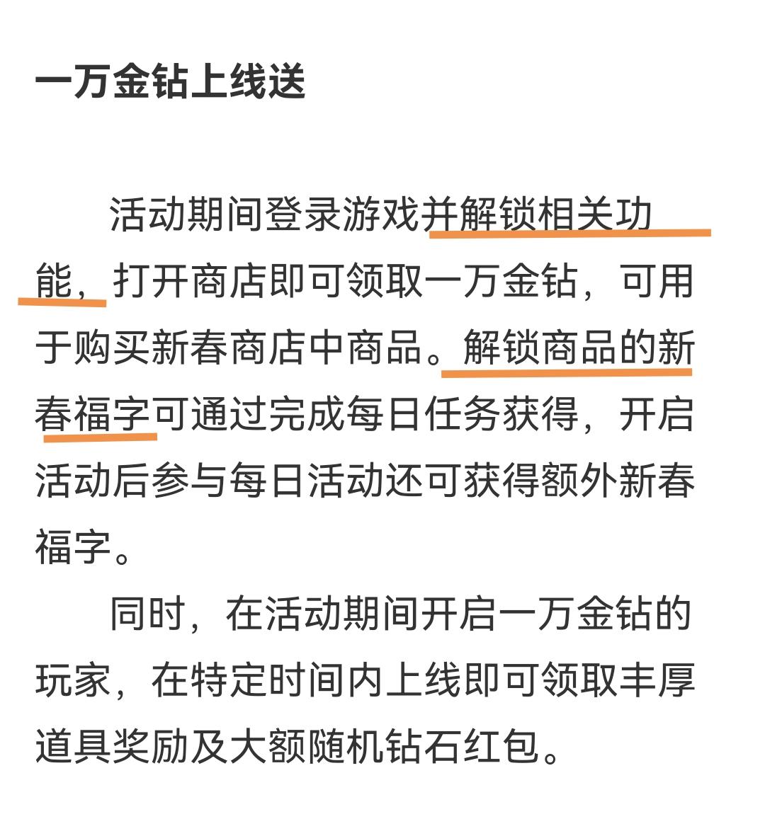根据新春福字的获得可以想象到,即使解锁了条件有了一万金钻,但是要用金钻购买相应的商品还得需要解锁商品的新春福字,这一波活动吸引眼球的是送一万金钻,但是能不能让你白嫖或者痛痛快快的使用金钻,还是看37怎么套路了。