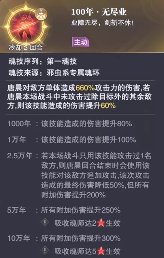 此外此技能的魂环效果除了进一步提升此技能的最终伤害外,还会有一个条件,如果唐晨在战斗中只是用该技能攻击过1名敌人,则唐晨回合结束后还会无消耗使用此技能对敌人造成攻击,虽然最终伤害会降低50%,但其所造成的附加伤害最高可以提升300%(10万年魂环效果)。