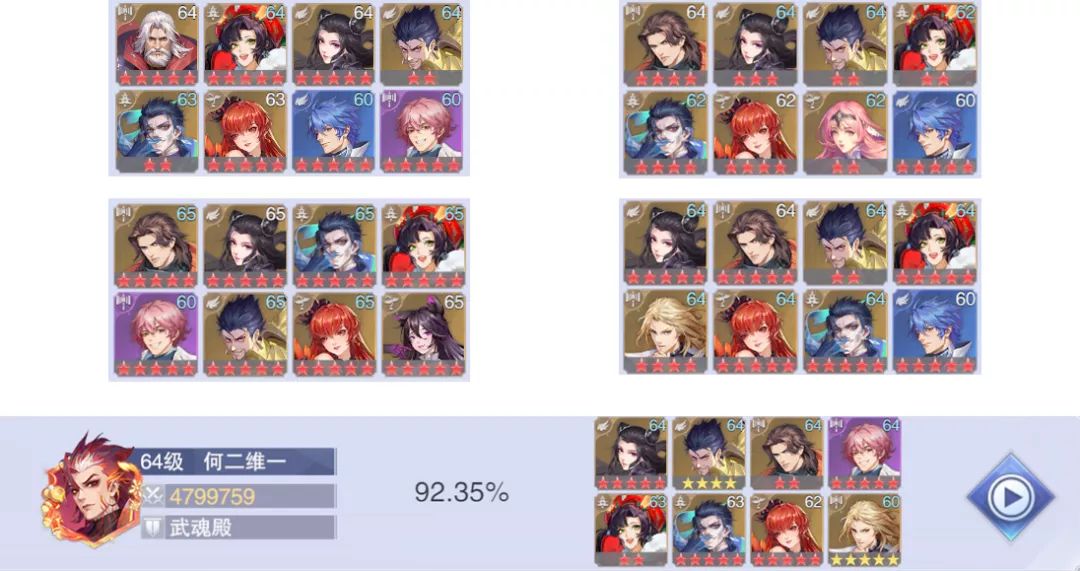2、核心增伤魂师依次为唐昊(2212)、唐月华(2221 or 1221)、蛇矛(X1XX)、鬼魅(1211)、火舞(2221)、御风(2112)、胡列娜(2221)