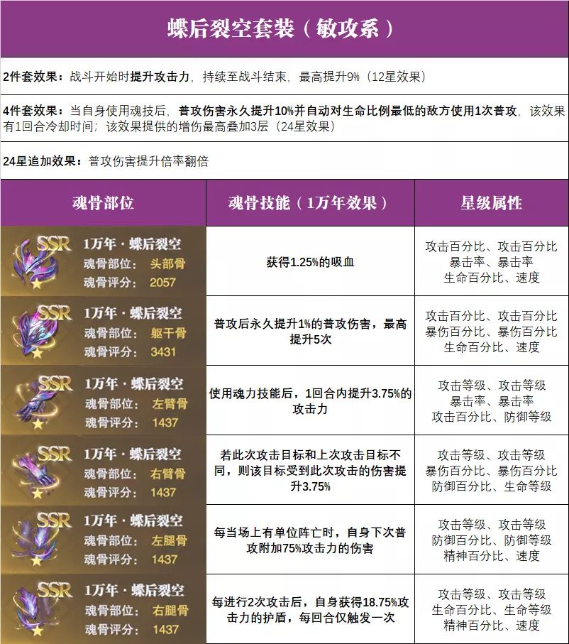 这里第一套敏攻魂骨为【蝶后裂空】,而这套魂骨也是目前游戏中敏攻系魂师用的较多的一套魂骨,其有以下这些特点: