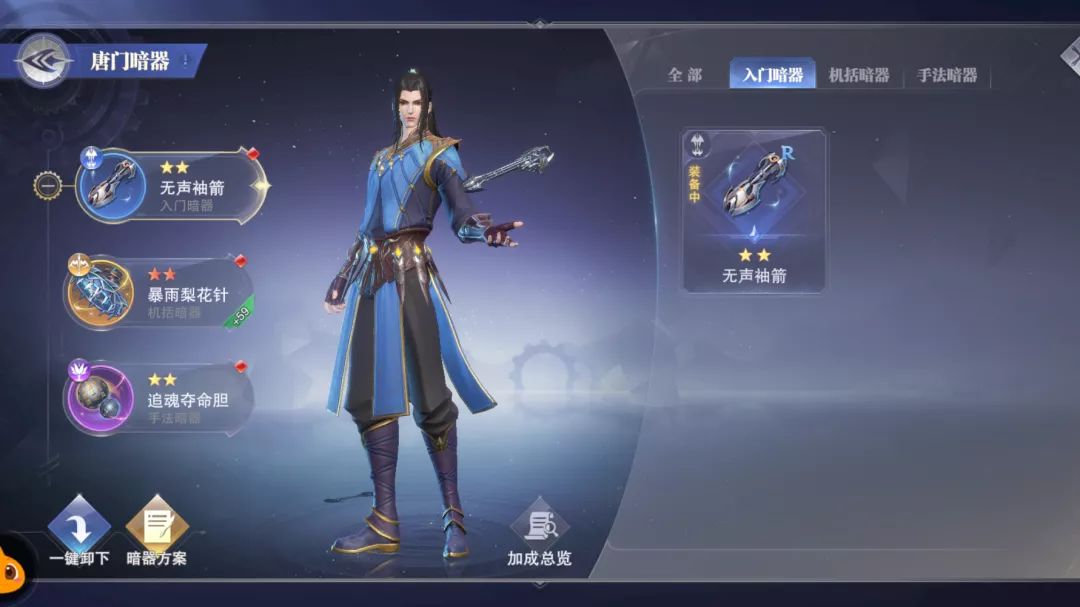 目前游戏中的唐门唐三一共是可以选择装配3个不同的暗器,分别是普攻入门暗器,1技能所对应的机括暗器和2技能所对应的手法暗器,而目前游戏中一共是有4个暗器可以选择,分别是普攻对应的【无声袖箭】,1技能对应的【暴雨梨花针】和【诸葛神弩】,2技能对应的【追魂夺命胆】。