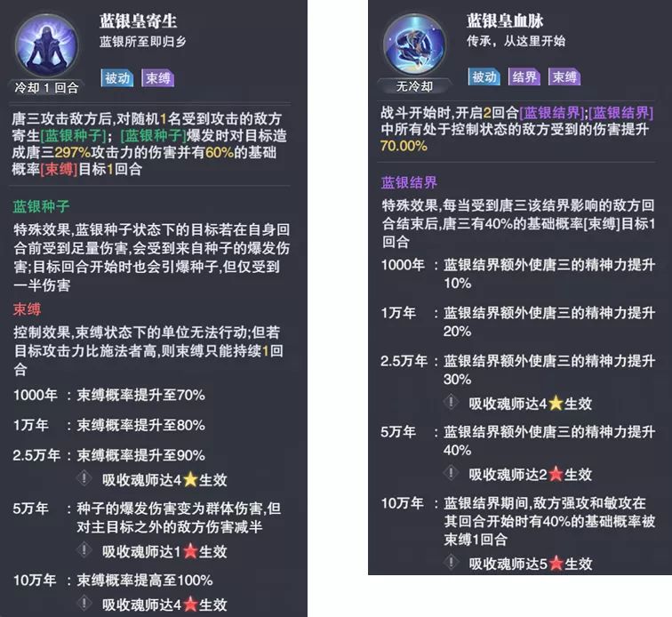 【蓝银皇寄生】和过去的SR唐三的种子技能几乎一致,简单意思就是唐三行动后会随机给一名敌方蓝银种子,然后敌人受伤或行动前就会被【束缚】,无法行动