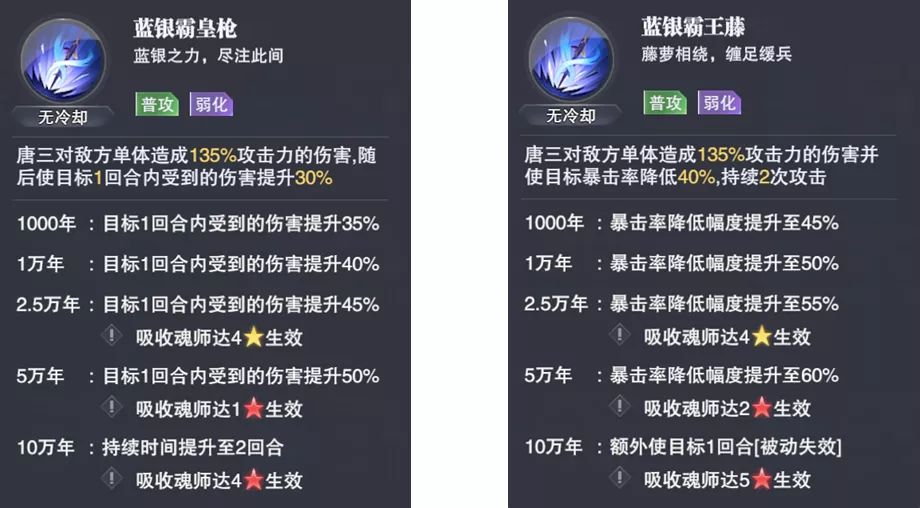 【蓝银霸王枪】的主要效果是增伤增伤增伤......50%持续2回合的效果也是很不错的,这也是让蓝银皇唐三具备打长图能力的最大原因