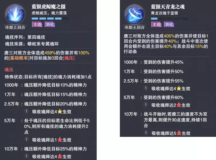 【蓝银虎鲸魔之摄】在群攻的同时可以对敌方施加一个非常有趣的状态【魂压】,这个效果可以增加对方使用技能的魂力消耗,同时还能降低对方的精神力,考虑到这个效果的施加概率非常高,且控制时间长达3回合,在PVP中可能会是一个非常有趣的反制技能